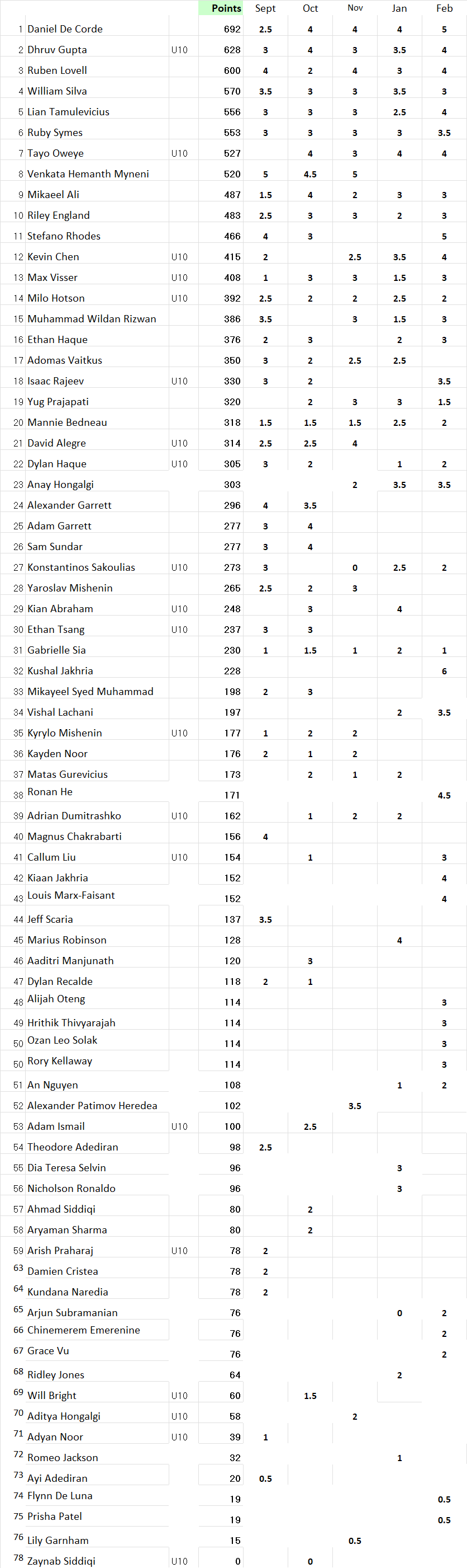 Each point (one for a win, half for a draw) in a Grand Prix tournament is multiplied by the number of tournament competitors to give Grand Prix Points. For example, two points in a 30-competitor event score 60 points; five in a 40-competitor event score 200.